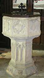 The 15th century font is of a traditional East Anglian pattern. It is octagonal in shape with tracery panels to the bowl and shaft. The panels on the bowl have shields and quatrefoils (a representation of a flower with four petals or a leaf with four leaflets)and a deeply traceried stem. It may once have had a cover similar to the one at Boxford but that was replaced over a hundred years ago with the more simple one you can now see.