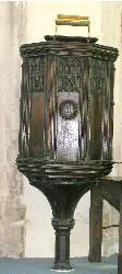 The pulpit is one of the best examples from the pre Reformation pulpit rising on a tall stem, beautifully proportioned and richly carved with paterae below a castellated rim. Its perfect condition was due mainly to its having been boarded up and plastered before the Restoration of the Monarchy and remaining hidden for a long period of time so escaping damage when the church was used as a prison during war with the Dutch in 1660.