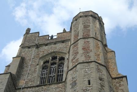 The perpendicular style tower is supported by three elegant angle buttresses with the stair turret on the south eastern corner. The clear tones of the eight bells escape through four large belfry windows. Excellent views of Sudbury and the water meadows can be seen from the top of the tower from between the stepped battlements.